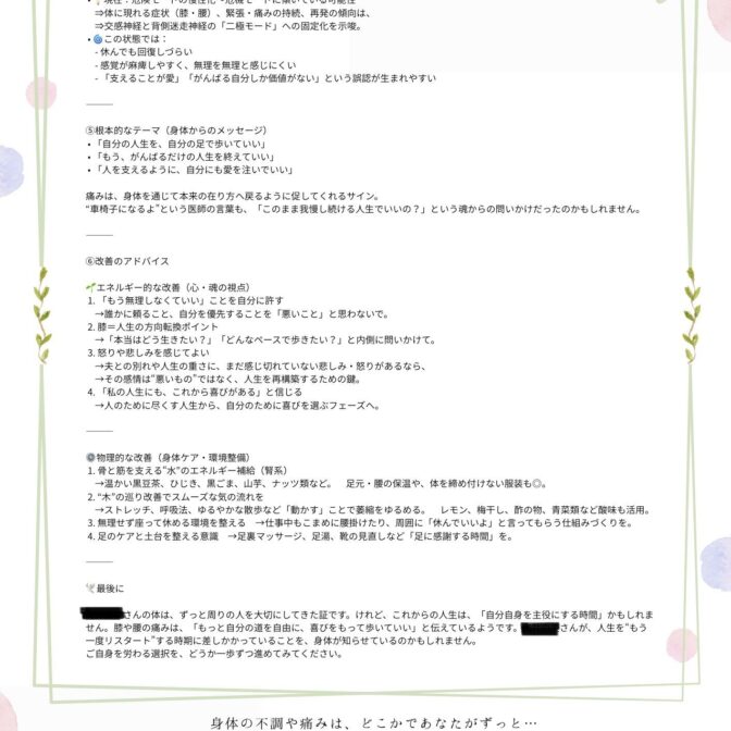 - 初めて身体のメッセージ診断書を受けました。思い当たることがありすぎてびっくり… なんとなく、我慢して、やり過ごしていくことに慣れてしまっていたことに反省しました。 そのことを身体がずっと教えてくれていたんだなと…思うと、 これからは、もっと身体の声を聞いてあげて、自分を大切にしたいと思います。 ありがとうございました!