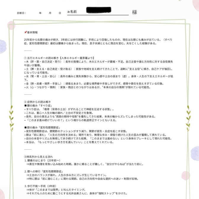 『身体のメッセージ診断書』は、過去の病歴や慢性的な疾患、持病(アレルギー、花粉症、鼻炎など)を元に、現在のあなたの身体のエネルギー状態・メッセージを診断します。これにより、五行エネルギーの流れや身体がどのモードにいるか(いたか)を探り、自身の健康管理やライフスタイルの見直しに役立てることができます。無意識に陥りがちな神経パターンを明らかにすることで、自分自身の身体の声に耳を傾け、より質の高い生活をサポートします。
