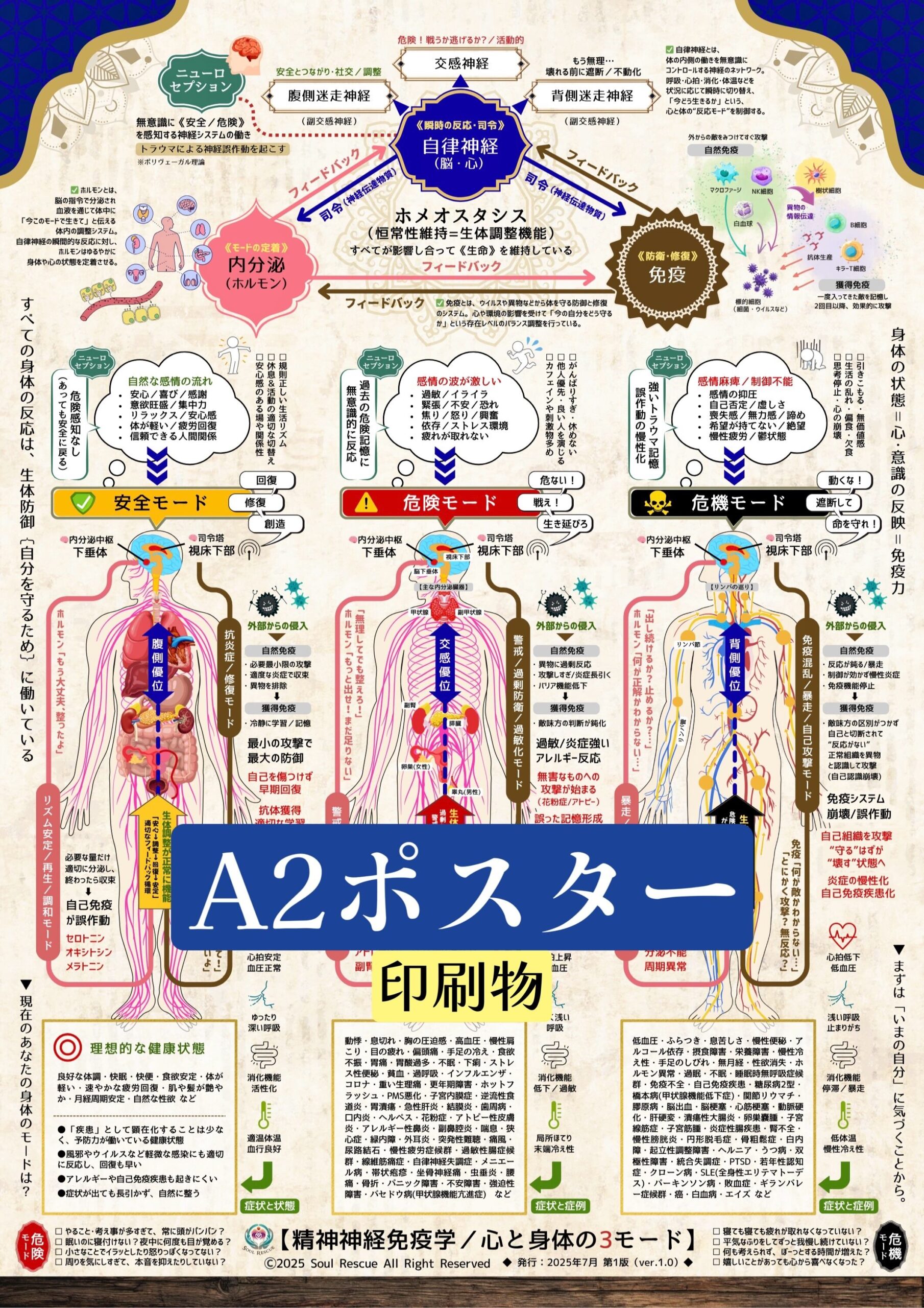 『心と身体の3モード』は、精神神経免疫学の神経・ホルモン・免疫システムのホメオスタシスの構造を基に、心と身体の3つのモードを視覚化したオリジナルポスターです。心の健康と身体のバランスを理解するための助けとなり、日常生活における体調管理やメンタルケア、自己理解の促進に役立ちます。いつでも見える場所に飾ることで、毎日の心身の状態を見つめなおすサポートを提供します。