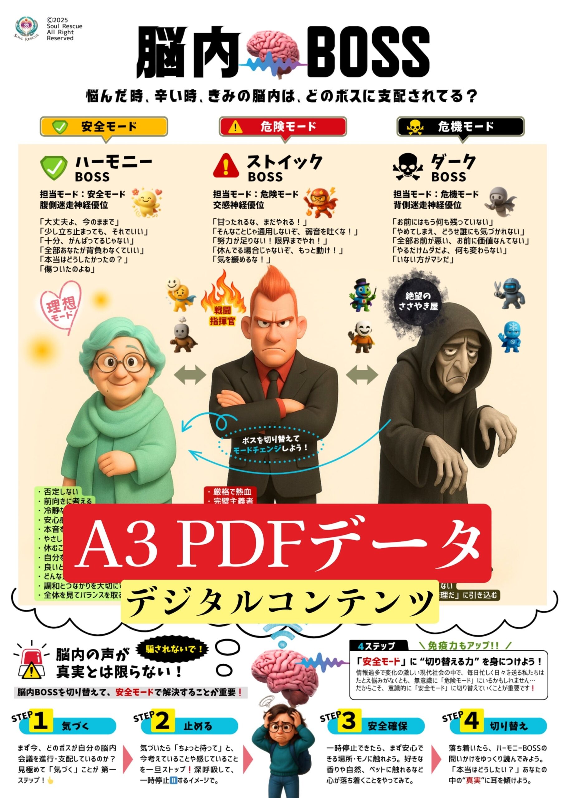 『脳内BOSS』 は、精神神経免疫学の神経・ホルモン・免疫システムのホメオスタシスの構造を基に、心と身体の3つのモードを視覚化したオリジナルポスター『心と身体の3モード』を、より解りやすくキャラクター化したものです。心の健康と身体のバランスを理解するための助けとなり、日常生活における体調管理やメンタルケア、自己理解の促進に役立ちます。毎日の心身の状態を「安全モード」に戻していくサポートとしてご活用ください。