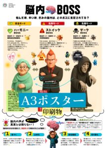 『脳内BOSS』 は、精神神経免疫学の神経・ホルモン・免疫システムのホメオスタシスの構造を基に、心と身体の3つのモードを視覚化したオリジナルポスター『心と身体の3モード』を、より解りやすくキャラクター化したものです。心の健康と身体のバランスを理解するための助けとなり、日常生活における体調管理やメンタルケア、自己理解の促進に役立ちます。毎日の心身の状態を「安全モード」に戻していくサポートとしてご活用ください。